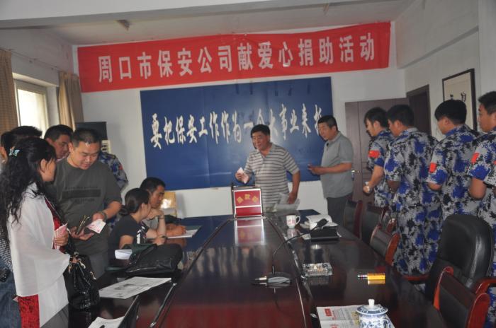 2014年6月9日上午,周口市保安服務(wù)公司管理人員在公司會議室舉辦了“向張宜兵同志先進(jìn)事跡學(xué)習(xí)動員會”,并為他進(jìn)行了捐款活動。會上,保安公司韓總經(jīng)理倡儀公司大力開展保安大討論活動,旨在通過討論活動,讓廣大保安員認(rèn)識到自身職責(zé)作用,提高社會各界對保安人員的認(rèn)識度。