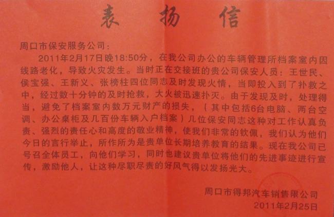 原來(lái)事情的經(jīng)過(guò)是這樣的:2011年2月17日晚18點(diǎn)50分,周口市得邦汽車銷售公司車輛管理所檔案室內(nèi)因線路老化,導(dǎo)致火災(zāi)發(fā)生。正在值班的人防場(chǎng)所大隊(duì)保安員王世民、侯寶強(qiáng)、王新義、張榜柱四位同志及時(shí)發(fā)現(xiàn)火情,當(dāng)即投入到救火之中,經(jīng)過(guò)數(shù)十分鐘的及時(shí)搶救,大火被迅速撲滅。由于發(fā)現(xiàn)及時(shí),處理的得當(dāng),避免了檔案室內(nèi)數(shù)萬(wàn)元的財(cái)產(chǎn)損失。