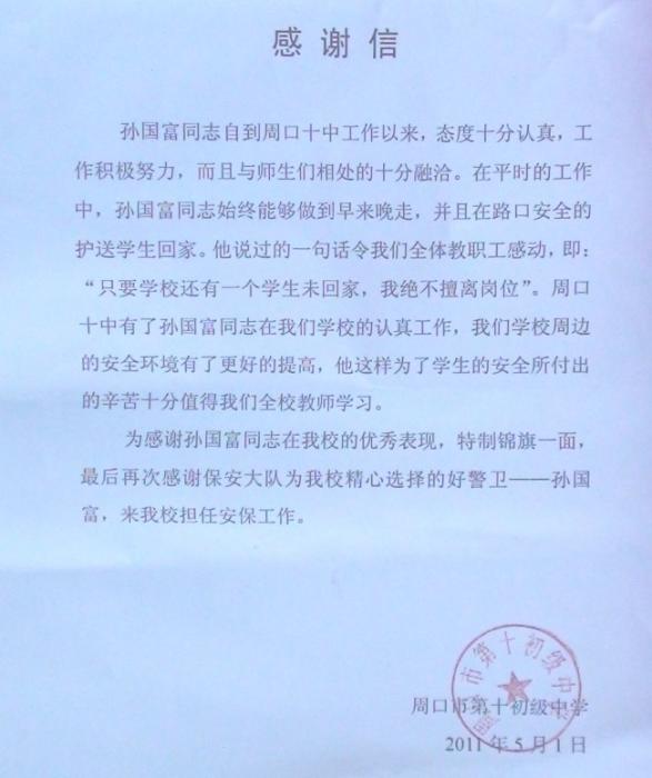 保安公司校園保安大隊(duì)孫國(guó)富同志認(rèn)真履行保安職責(zé),積極配合周口十中校園安保工作,工作積極努力,堅(jiān)守工作崗位,維護(hù)學(xué)校師生利益,確保校園安全,受到校方一致好評(píng)和高度贊揚(yáng),樹立了周口校園保安的良好形象。