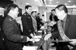 市保安公司總經(jīng)理韓國(guó)華(左一)為先進(jìn)工作人員頒發(fā)獎(jiǎng)匾。為鼓勵(lì)先進(jìn),鞭策后進(jìn),激勵(lì)廣大保安隊(duì)員工作積極性,近日,市保安公司召開(kāi)2011年度工作總結(jié)表彰大會(huì),公司機(jī)關(guān)全體工作人員和各縣(市)分公司及公司押運(yùn)、技防、人防人員200余人參加了表彰大會(huì)。(記者 陳永團(tuán) 通訊員 王俊超 攝)
